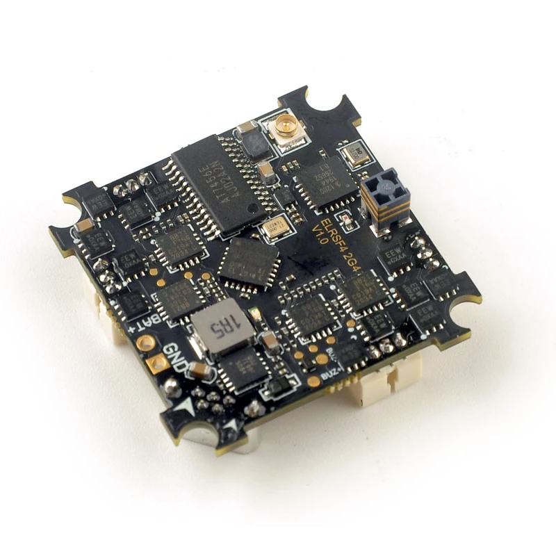 The ELRS F4 2G4 AIO flight controller is the world’s first with a built-in 2.4 GHz Express LRS SPI receiver.
