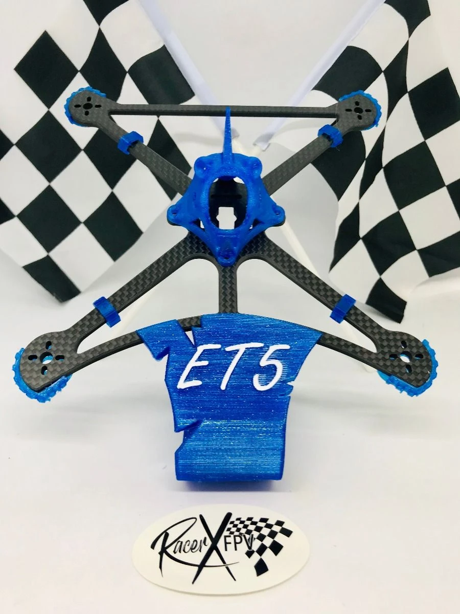 With the release of the HQ T5x3x2 lightweight t-mount props and the need of a true lightweight 5? frame in the industry, Racer X FPV continues to innovate and has designed the ET5 “Extraterrestrial TWIG 5”. The ET5 is a mutated TWIG frame that can accommodate 5? props. The frame is premium 3.5mm thick high grade T700 carbon cut along the weave and chamfered on both sides interior and exterior edges at .8mm. The frame measures approximately 200mm from motor post to motor post. Motor mounting is for 4-hole 9×9 or 12×12 motor mounts. You do not have to use t-mount motors as there are also a lot of 5mm shaft motors from 15xx to 16xx that are great choices as well as lots of 5mm 5? shaft props to choose from on the market. We highly recommend keeping your motors under 18 grams since this is a lightweight frame. With our strong signature cross bar design, we were able to design a super lightweight 5? frame at only 3.5mm, yet super durable and stiff to allow it to track like all our amazing frames do. The ET5 can accommodate a standard 20×20 stack or a whoop toothpick aio.