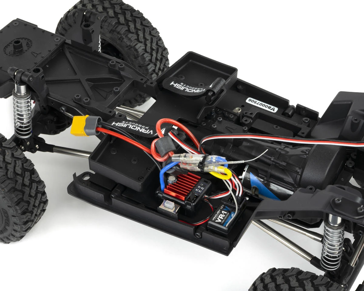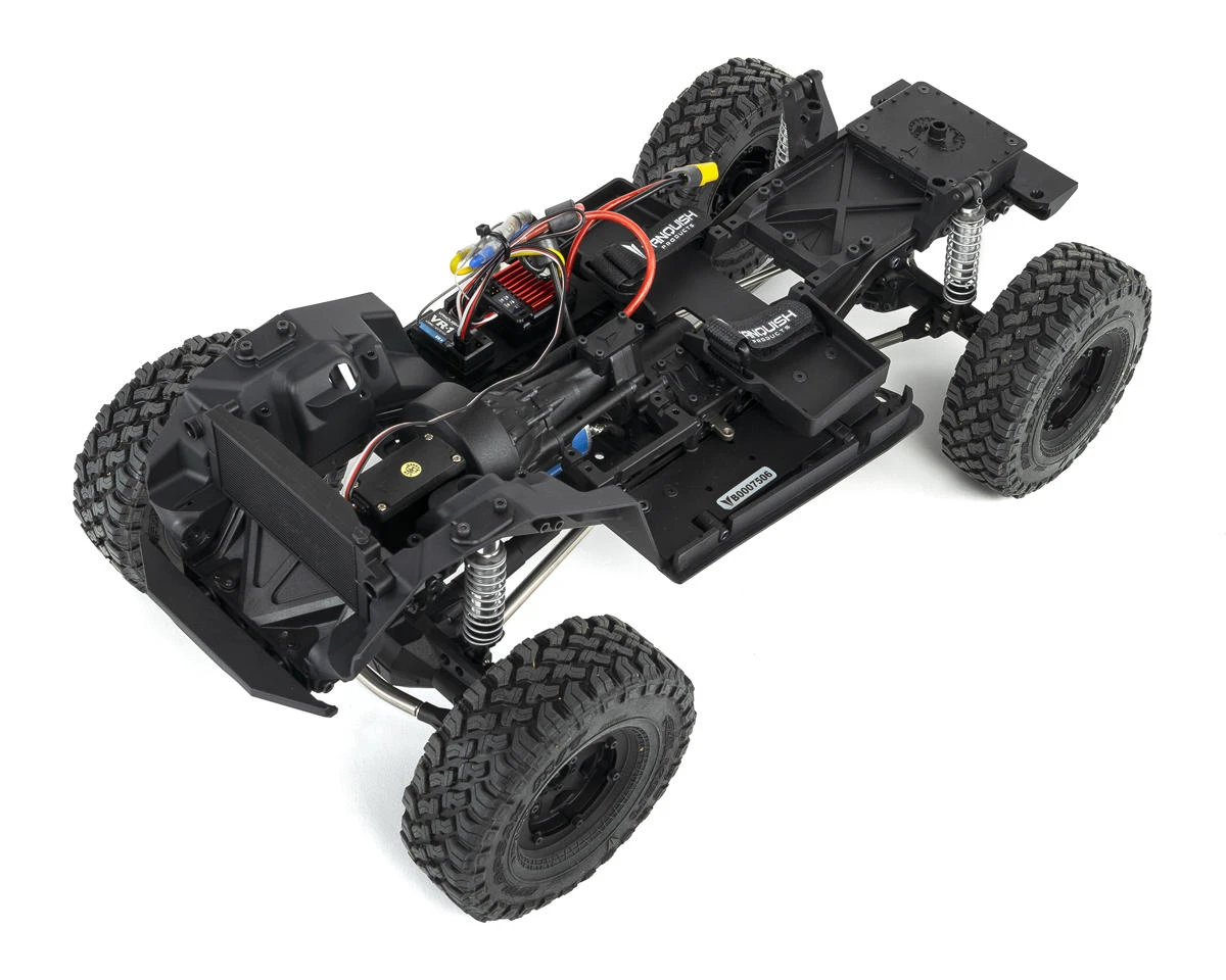 This is the Vanquish Products VS4-10 Phoenix Straight Axle RTR Rock Crawler. With their first entry in the RTR market Vanquish Products has created a must have vehicle packed with the high quality components you expect from this premium brand. Equipped with the sought after VFD Twin transmission and F10 Straight Axles this capable crawler is ready to hit the trail. Featuring a 6% OD (Over Drive) VFD gearset, powered by a 35T VM-1 Motor and VE-1 3S capable ESC, slow speed control and overall crawling performance is extremely impressive. Adding to the capability is the included full function digital 4-Channel VT-1 Transmitter. With multiple model memory and end point adjustment, this transmitter allows the VS4-10 Phoenix RTR to be equipped with an optional fully functioning front Dig and selectable Over Drive giving you next level crawling performance. Locating the axles is a set of stainless steel links providing precise suspension movements and the ability to withstand aggressive use. The drivetrain is equipped with machined ring and pinion gears, chromoly universal axle shafts, and chromoly 6-bolt spools for ultimate durability. With full ball bearings throughout, metal transmission gears and 32P spur/pinion gears the drivetrain provides smooth and reliable performance when tackling the toughest terrain.